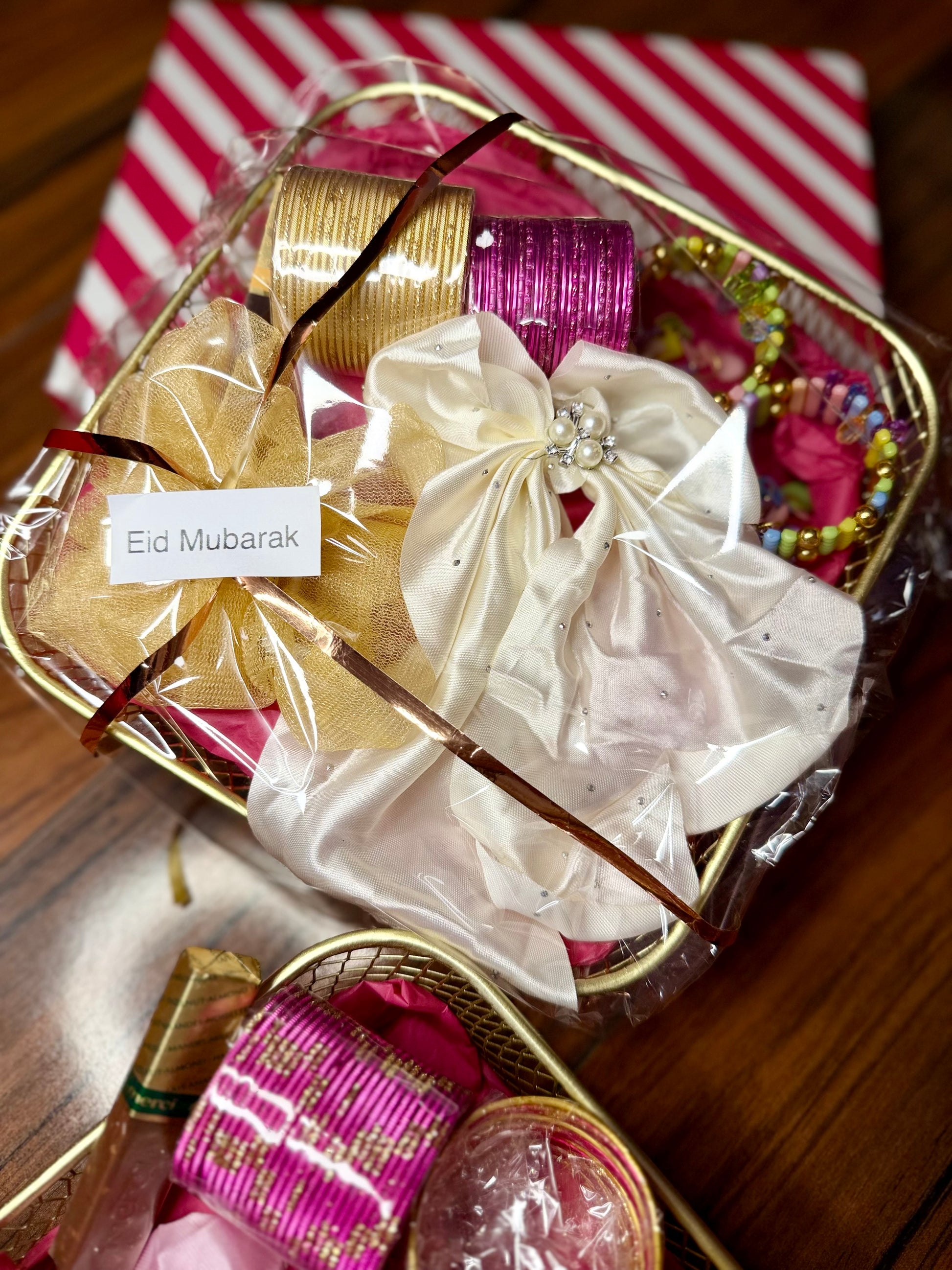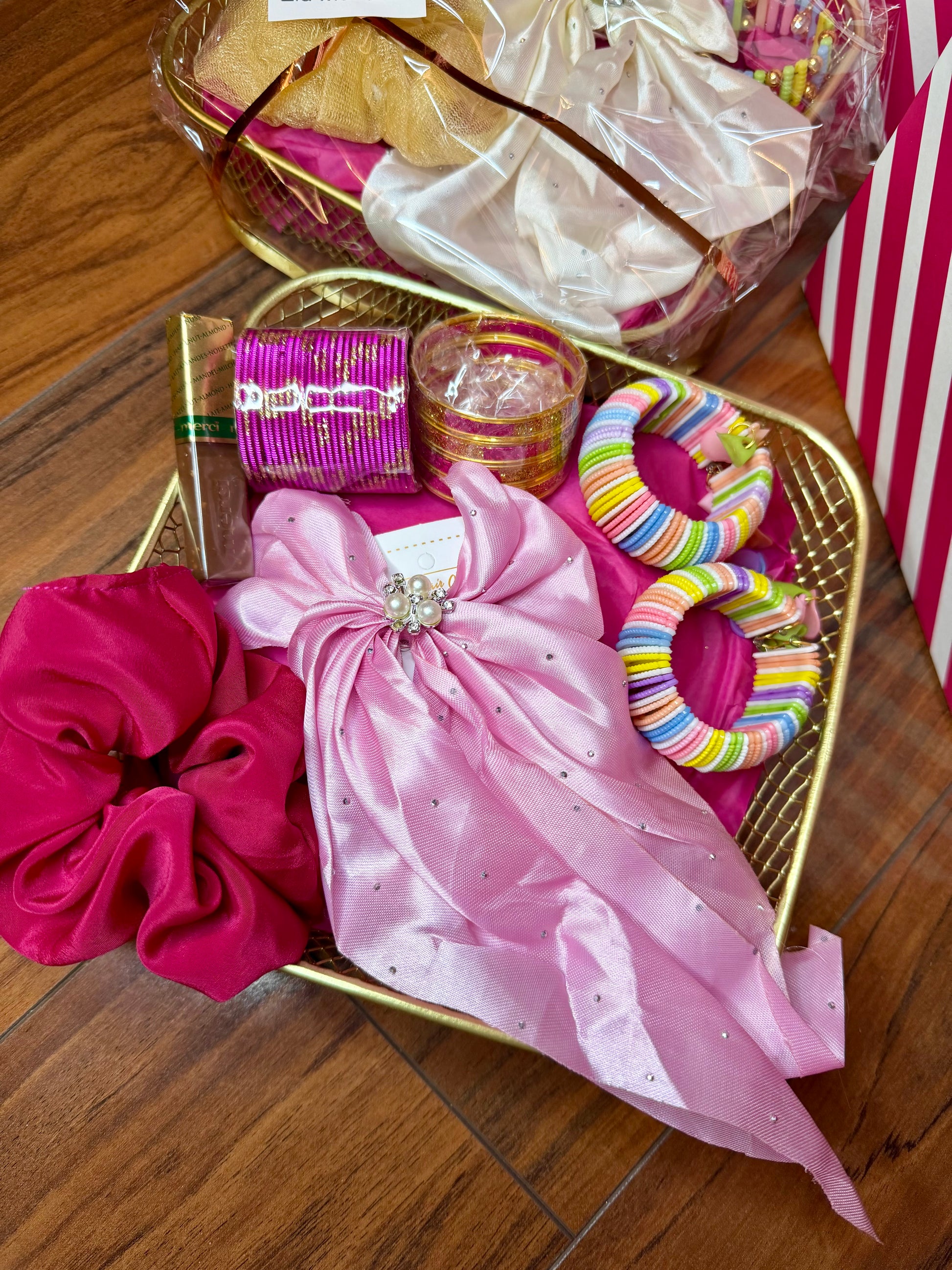 2 Metal Bangles Set, 2 adjustable bracelets, 1 Scrunchie, 1 Hair Bow & 1 sweet comes in a beautiful golden basket with a personalised note (leave a note on checkout).