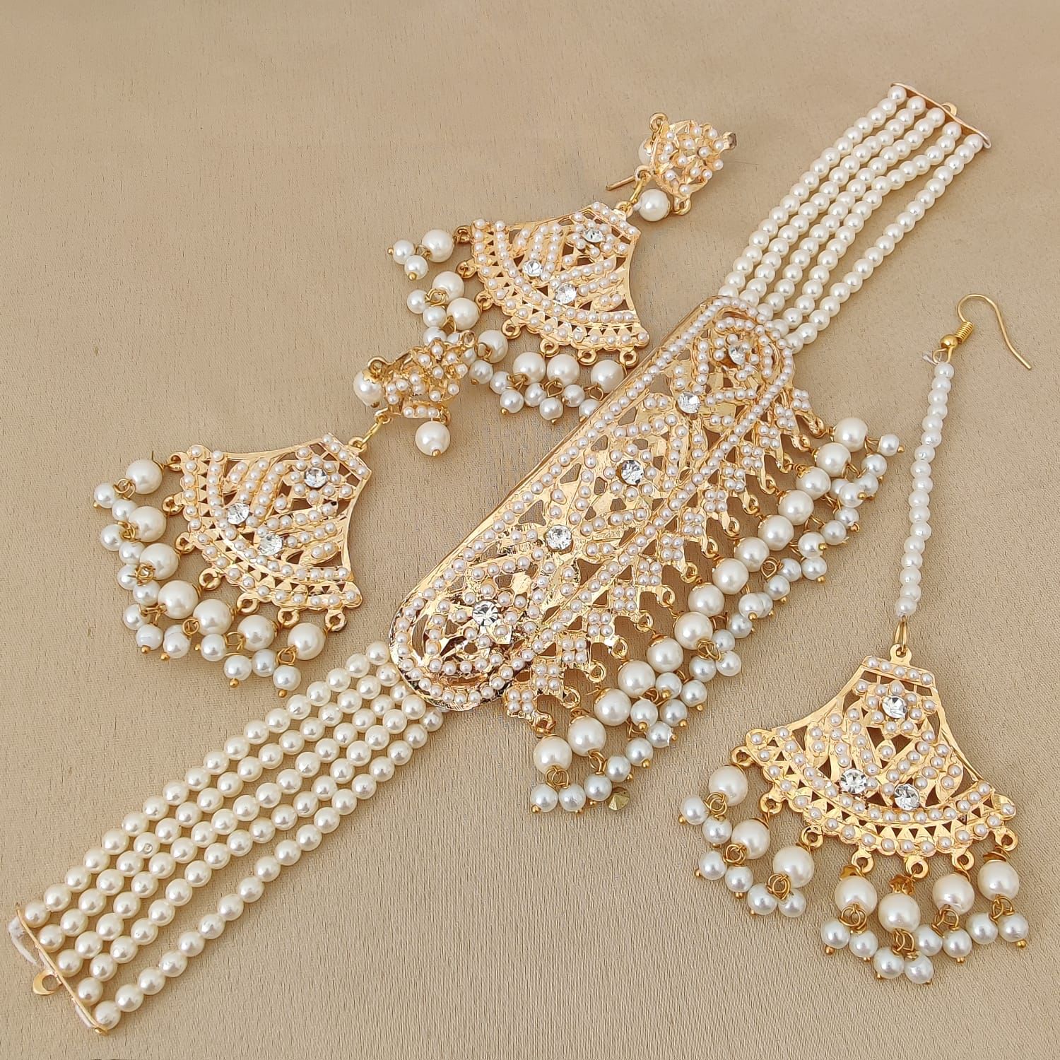 Pearl Jadau Choker, Earings & Maang Tikka Set